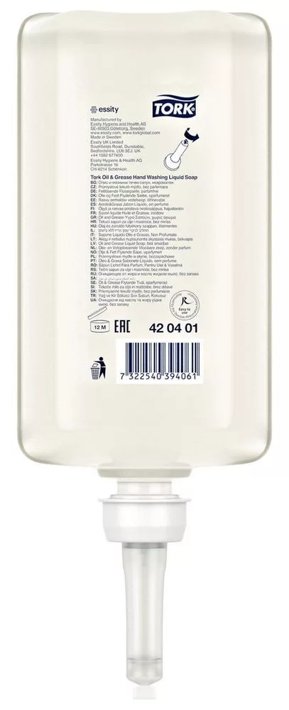 A szennyeződések, olajok és zsiradékok eltávolítására szolgáló Tork olaj- és zsíroldó folyékony szappan hatásos összetevőket tartalmaz, mégis kíméli a bőrt. Nem tartalmaz hozzáadott illatosítóanyagokat és színezékeket – kíméli a bőrt. A Tork folyékony- és sprayszappan-adagolókkal együtt használható, használata tanúsítottan egyszerű, és minden felhasználó számára megfelelő kézhigiéniát biztosít.