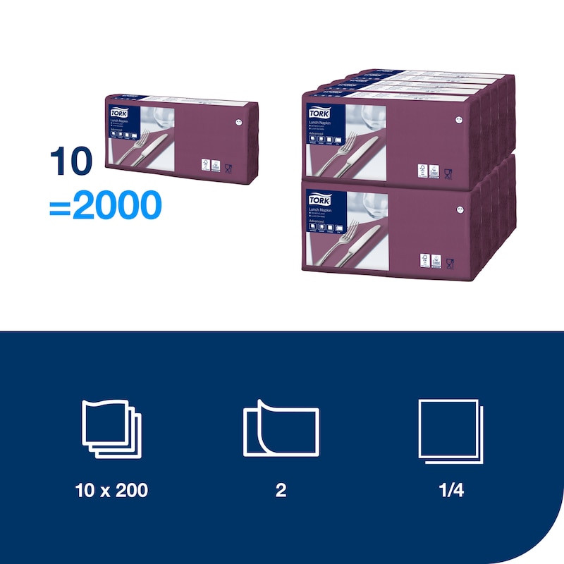A Tork Lunch szalvéták elsősorban könnyű ételekhez illenek. Többféle modern és klasszikus színben kaphatók, így kiválóan illeszkednek bármelyik étterem színvilágához.